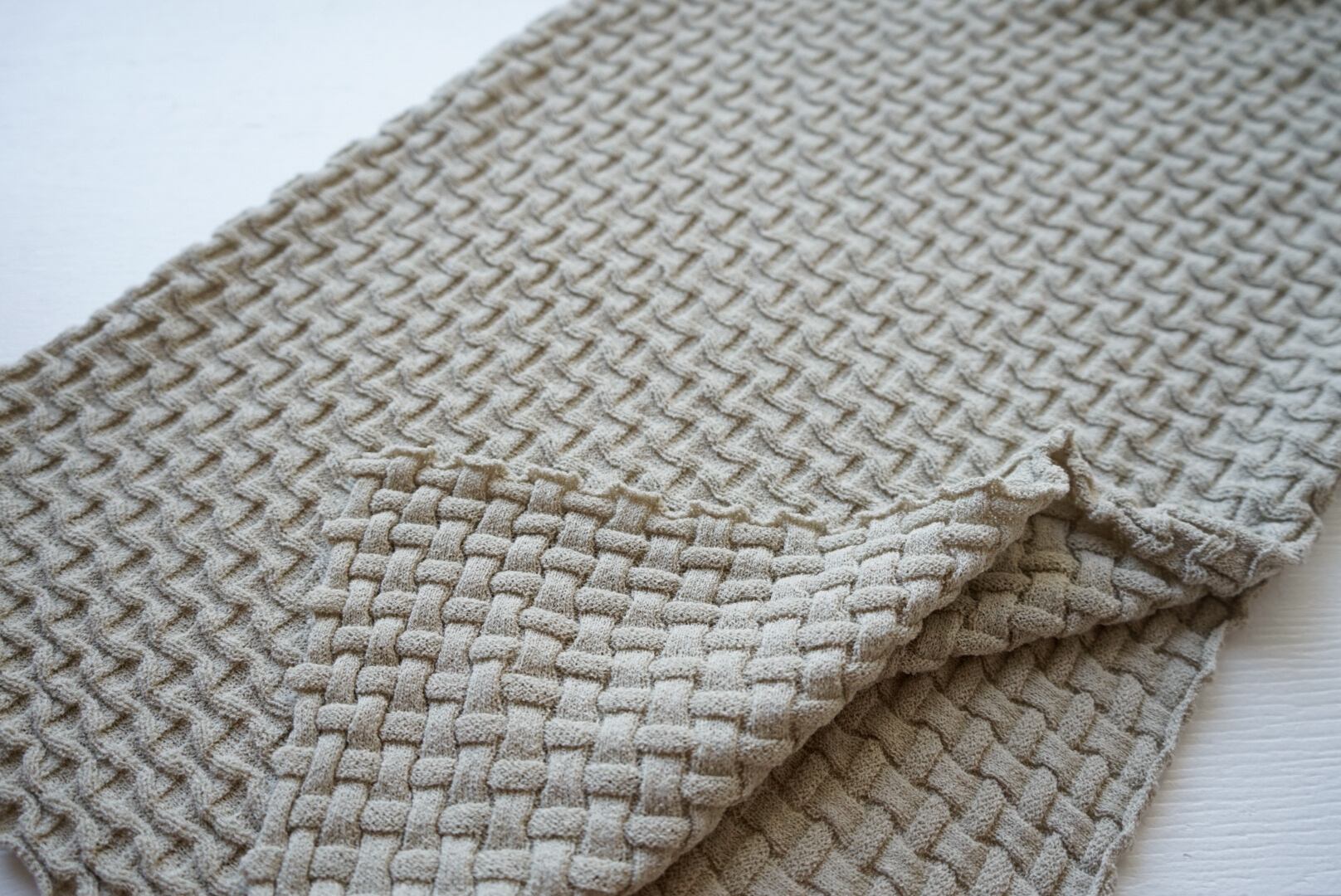 籠模様をイメージして編まれた編み地もポイントとなり、片側は籠編みのような表情をお楽しみいただけるが、一方はニットの伸縮もあって少し波打つような表情をお楽しみいただける。