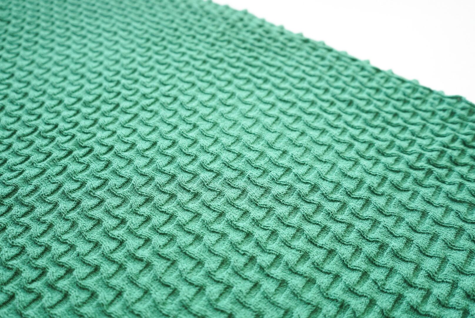 籠模様をイメージして編まれた編み地もポイントとなり、片側は籠編みのような表情をお楽しみいただけるが、一方はニットの伸縮もあって少し波打つような表情をお楽しみいただける。