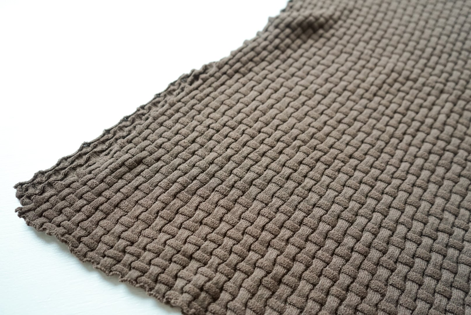 籠模様をイメージして編まれた編み地もポイントとなり、片側は籠編みのような表情をお楽しみいただけるが、一方はニットの伸縮もあって少し波打つような表情をお楽しみいただける。