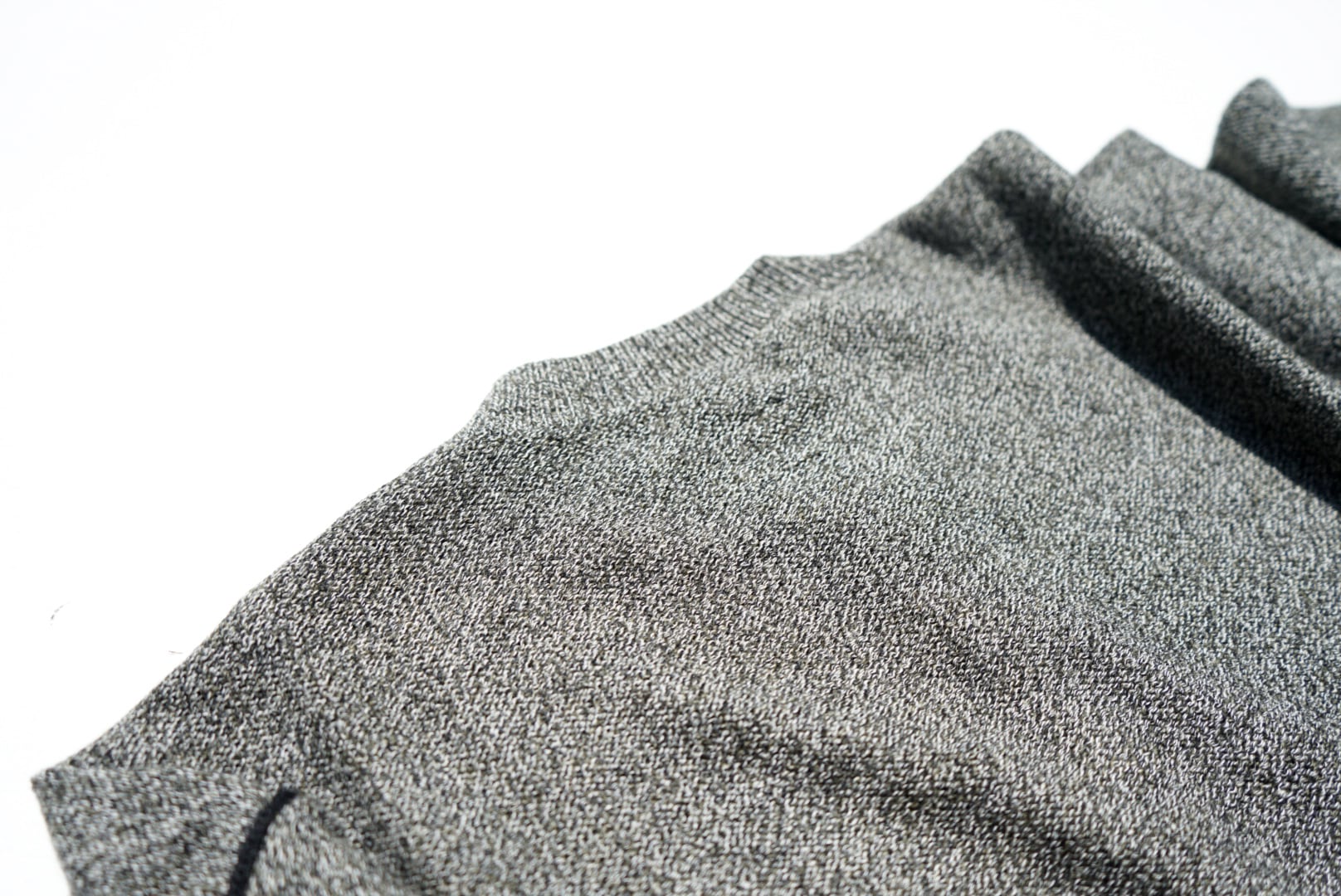 異なる色と素材の3種の糸を撚り合わせ1本の糸をつくり、その糸を使って編むことでこの奥行きのあるニットが生まれたのだ。