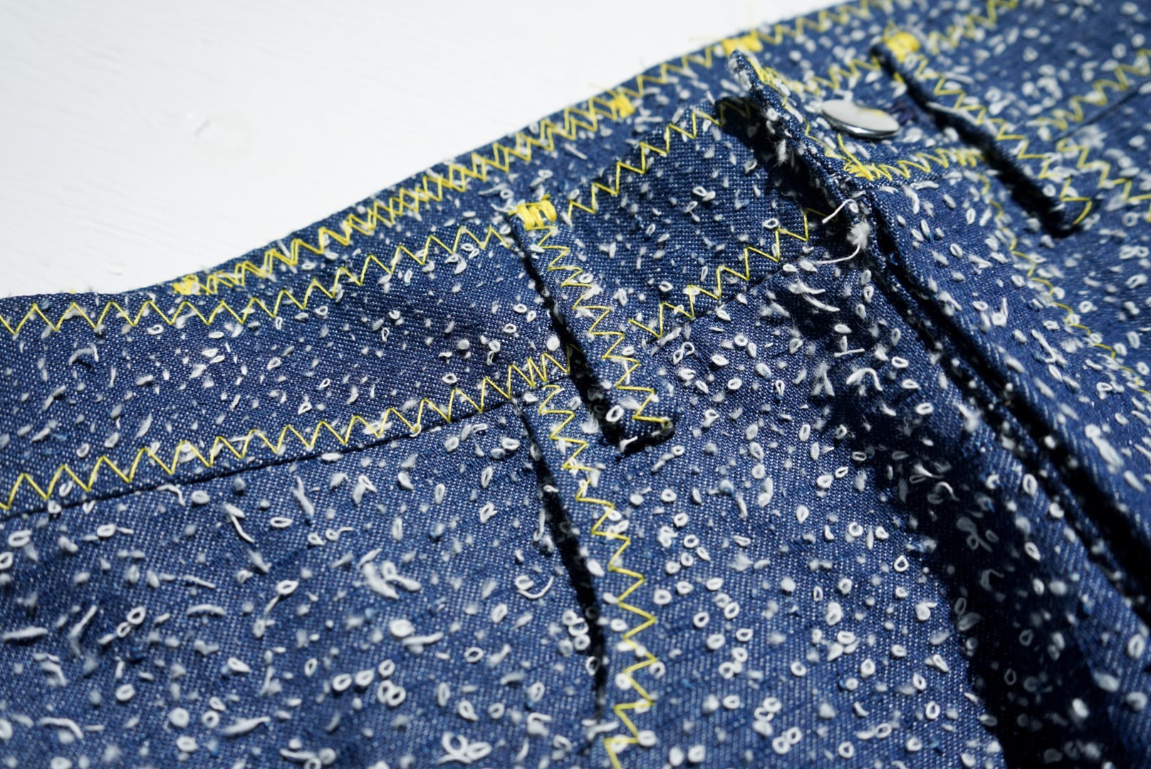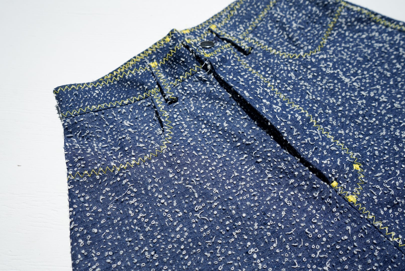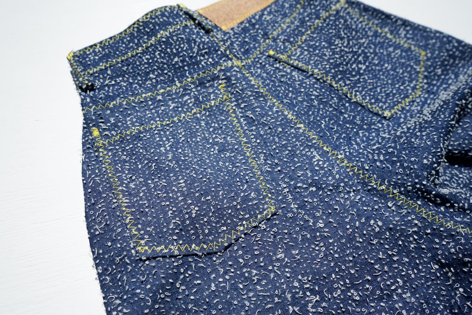 デニム生地の緯糸(よこいと)を引っ掻き出して、生地の表面にポコポコとした、不思議な表情を与えてくれている。