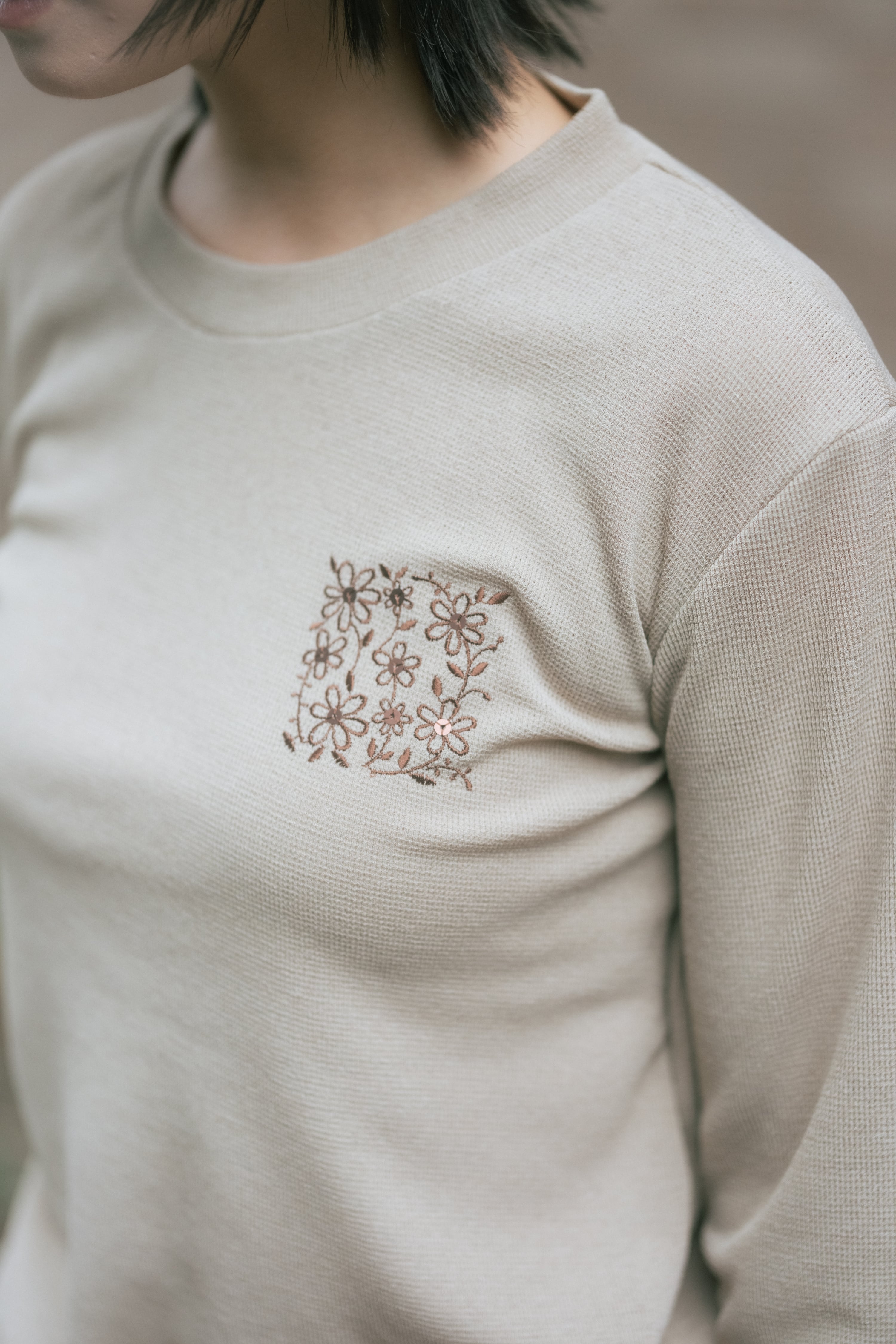 一見するとシンプルに見えるトップスも、お花の刺繍にはビーズなども用いられていて、抜かりがない。