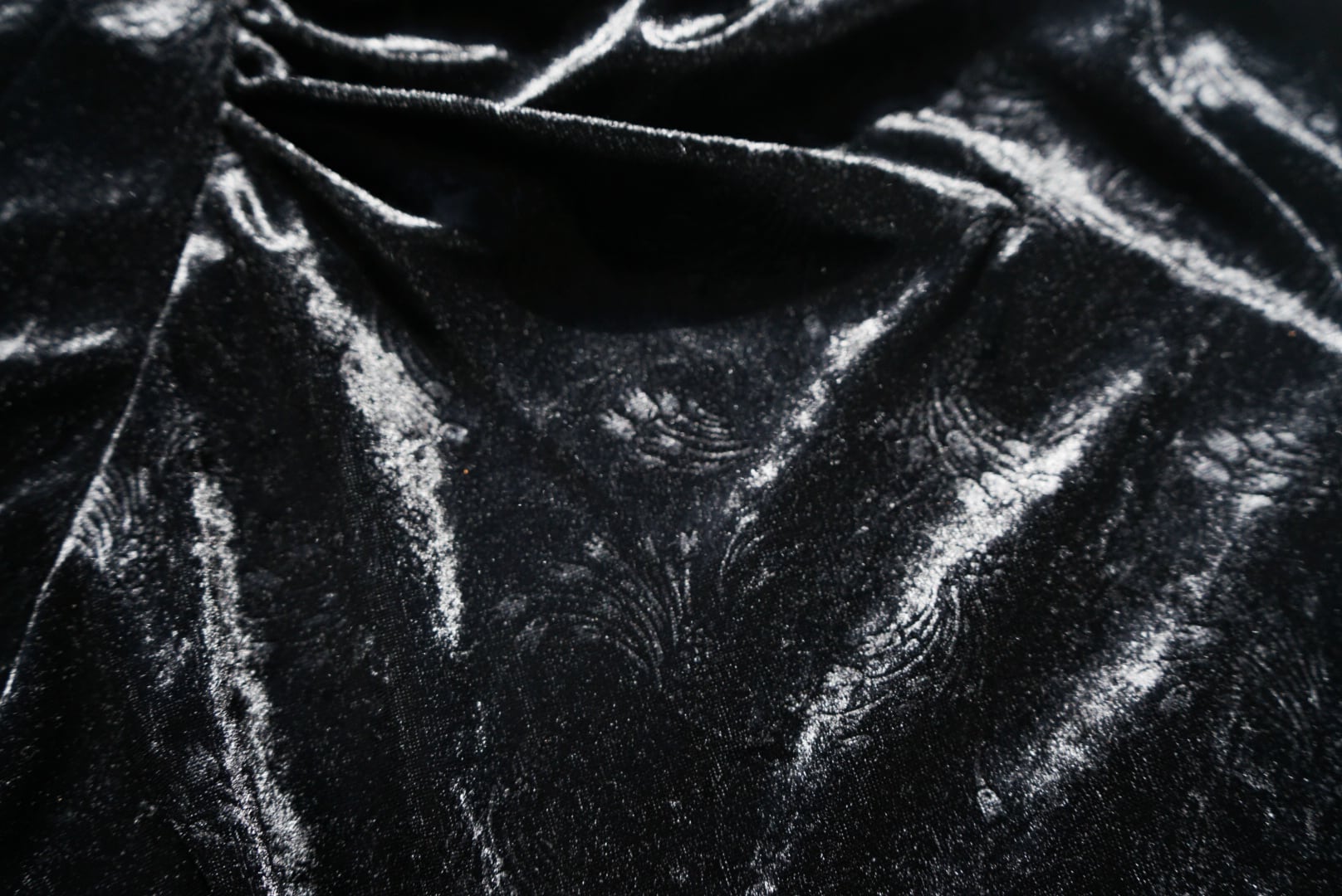 柔らかなベロア素材がストンとおち、腕周りにユニークなシルエットを生み出す。