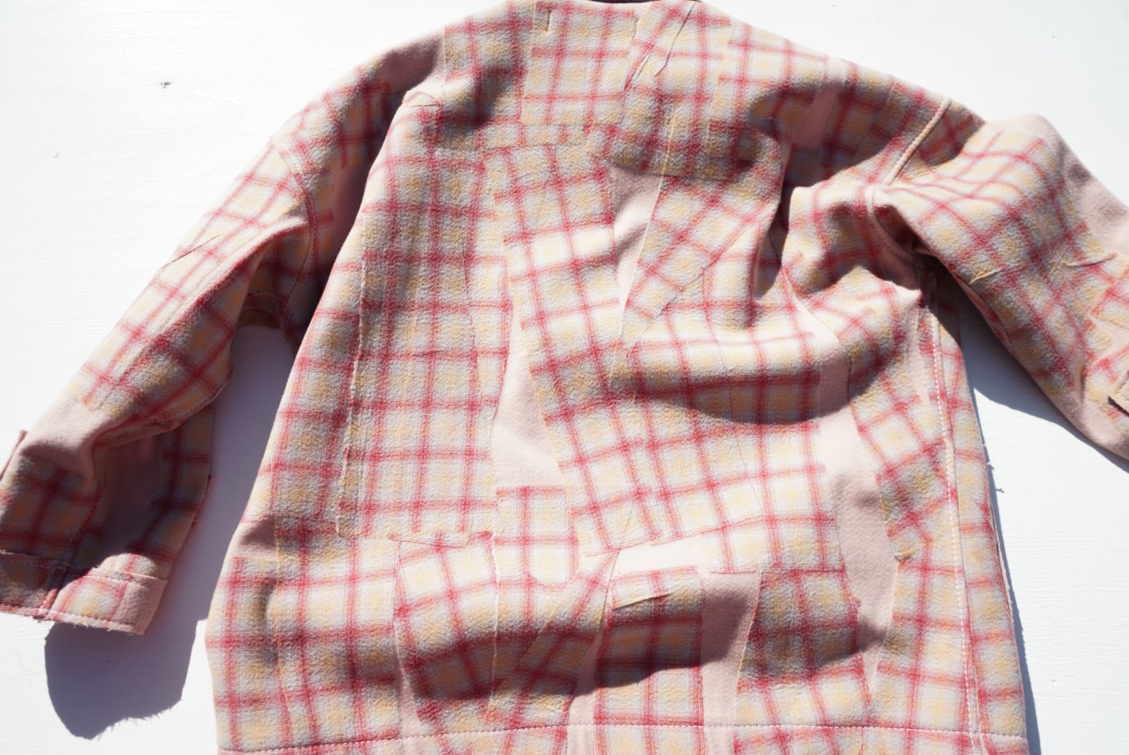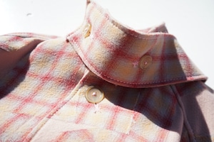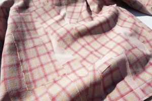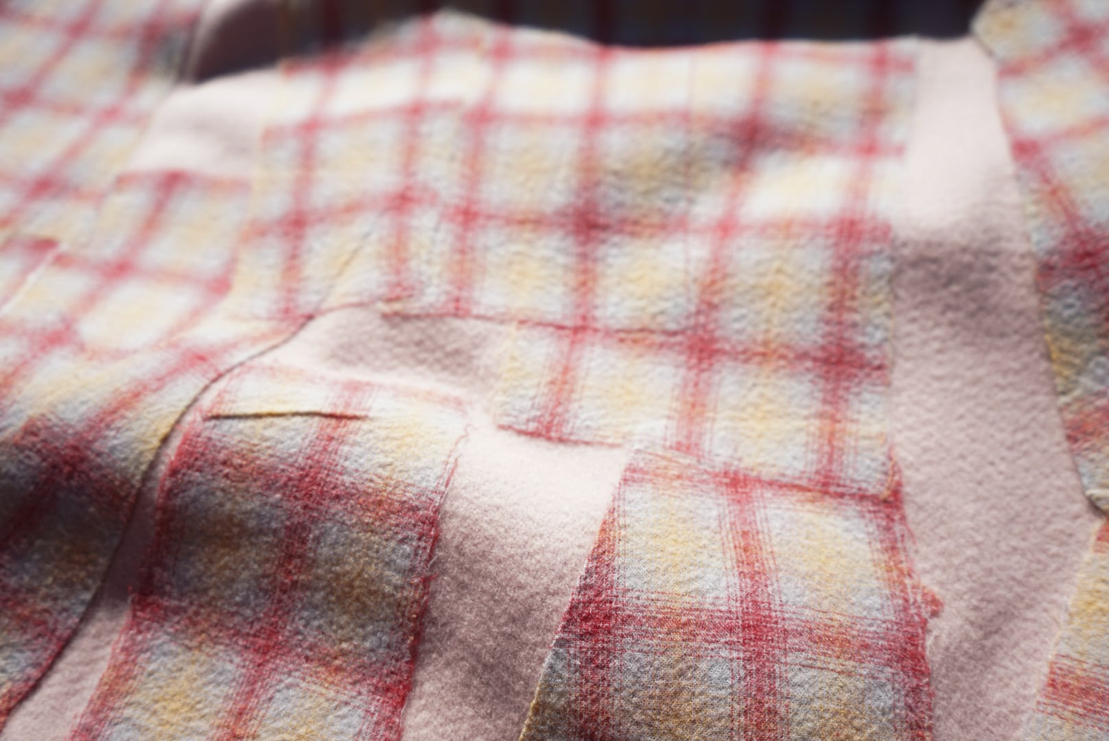 ピンクのウール素材をベースに、ピンクと黄色が差し色となったチェックのオンブレ生地をニードルパンチで1枚にした生地。