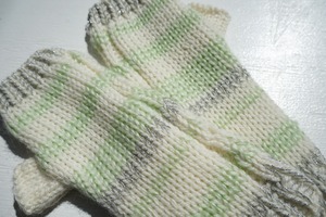 柔らかなウールの白をベースに、淡い緑とシルバーのラメ糸が程よいアクセントとなり、その可愛らしさだけでなんだかほっこりとした気持ちにさせてくれる。