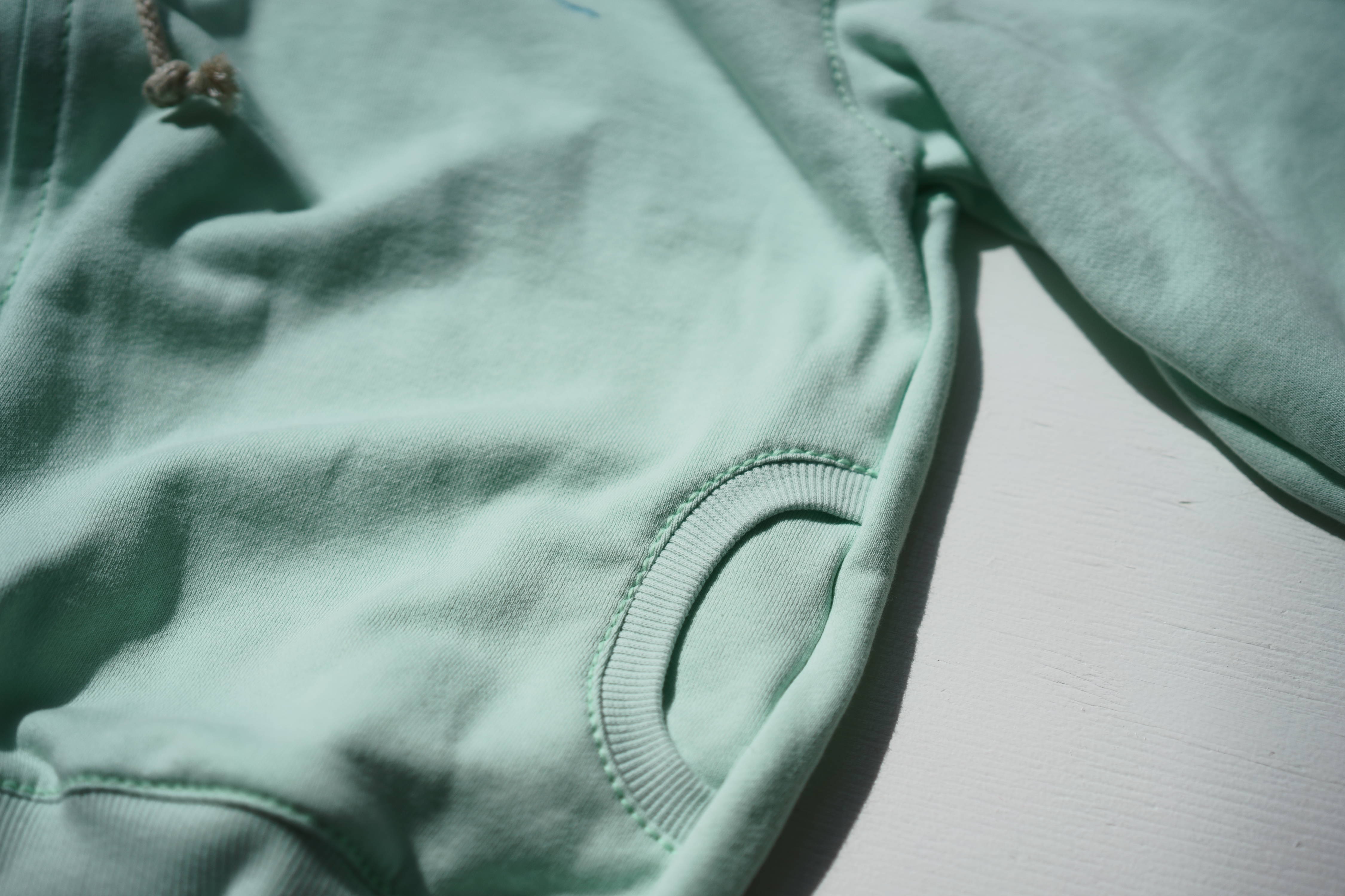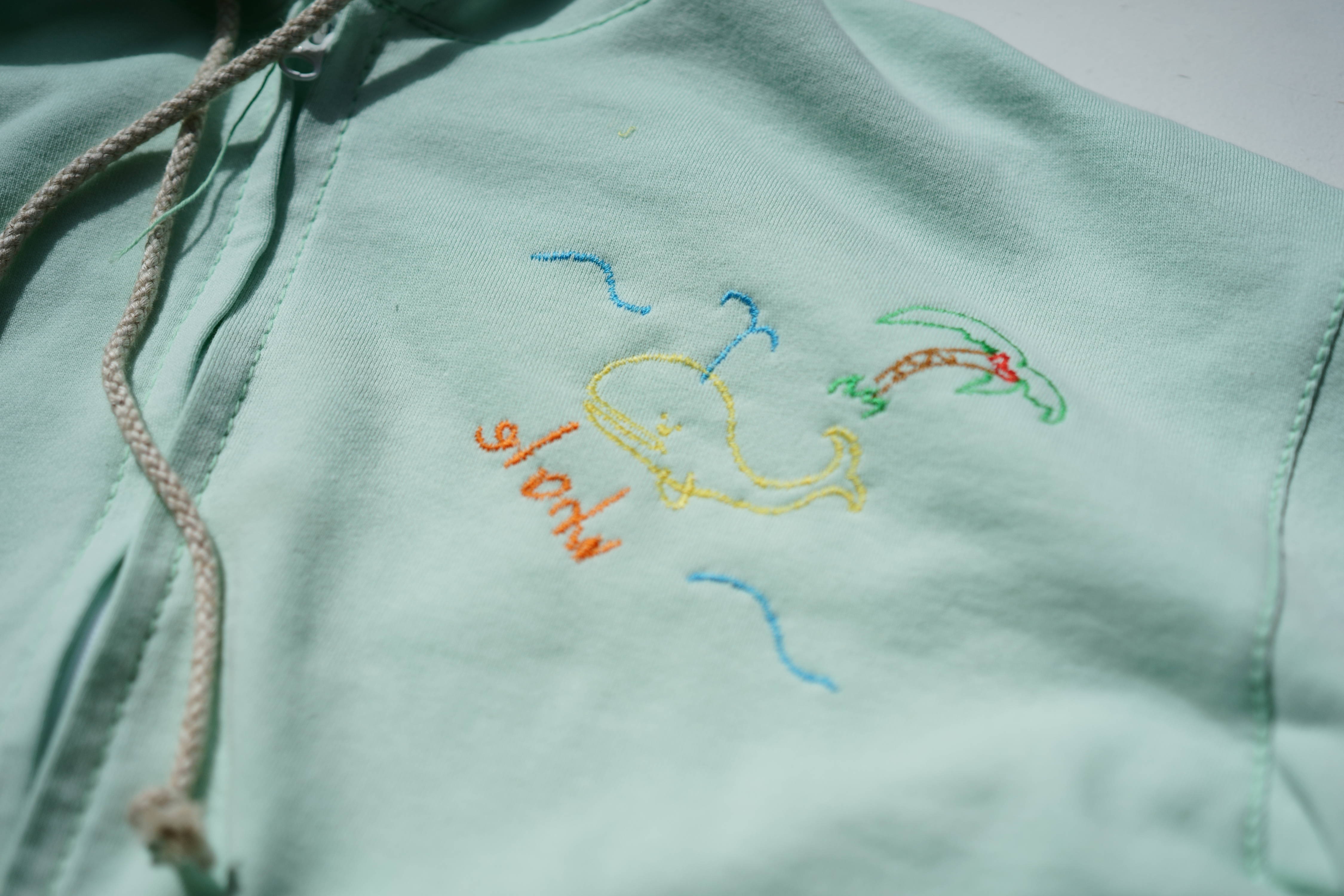 胸のワンポイント施された鯨や椰子の木刺繍はもちろんのことだが、同系色のミントカラーの糸のステッチワークも統一感があり素敵だ。