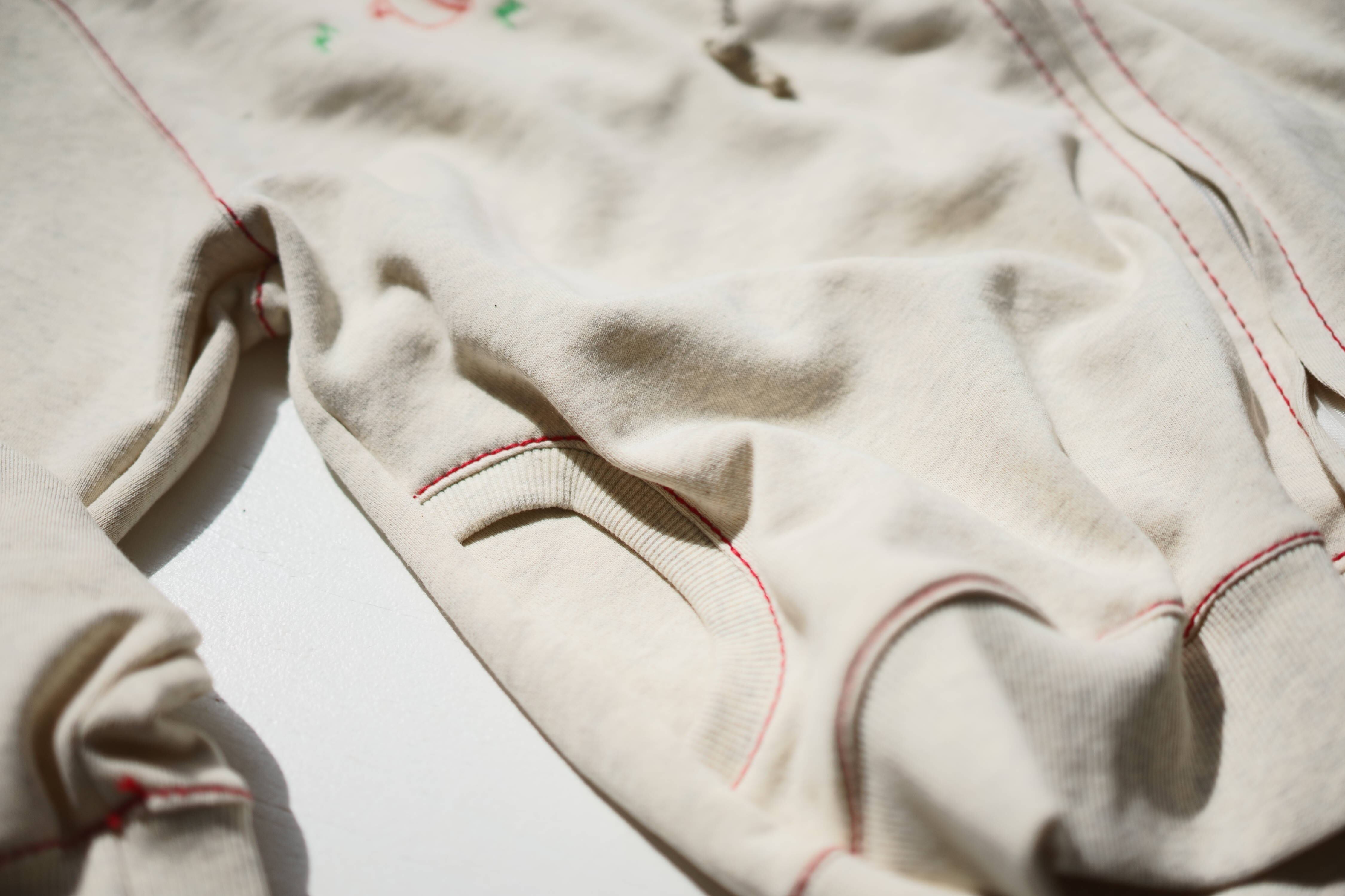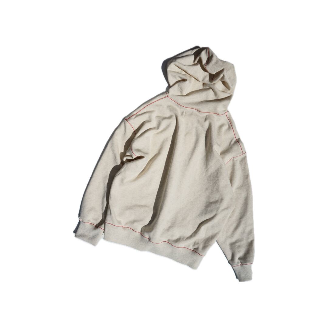 オートミールのナチュラルな雰囲気を感じるフーディーに、赤色のステッチがどこか春夏っぽさを与えてくれるようだ。