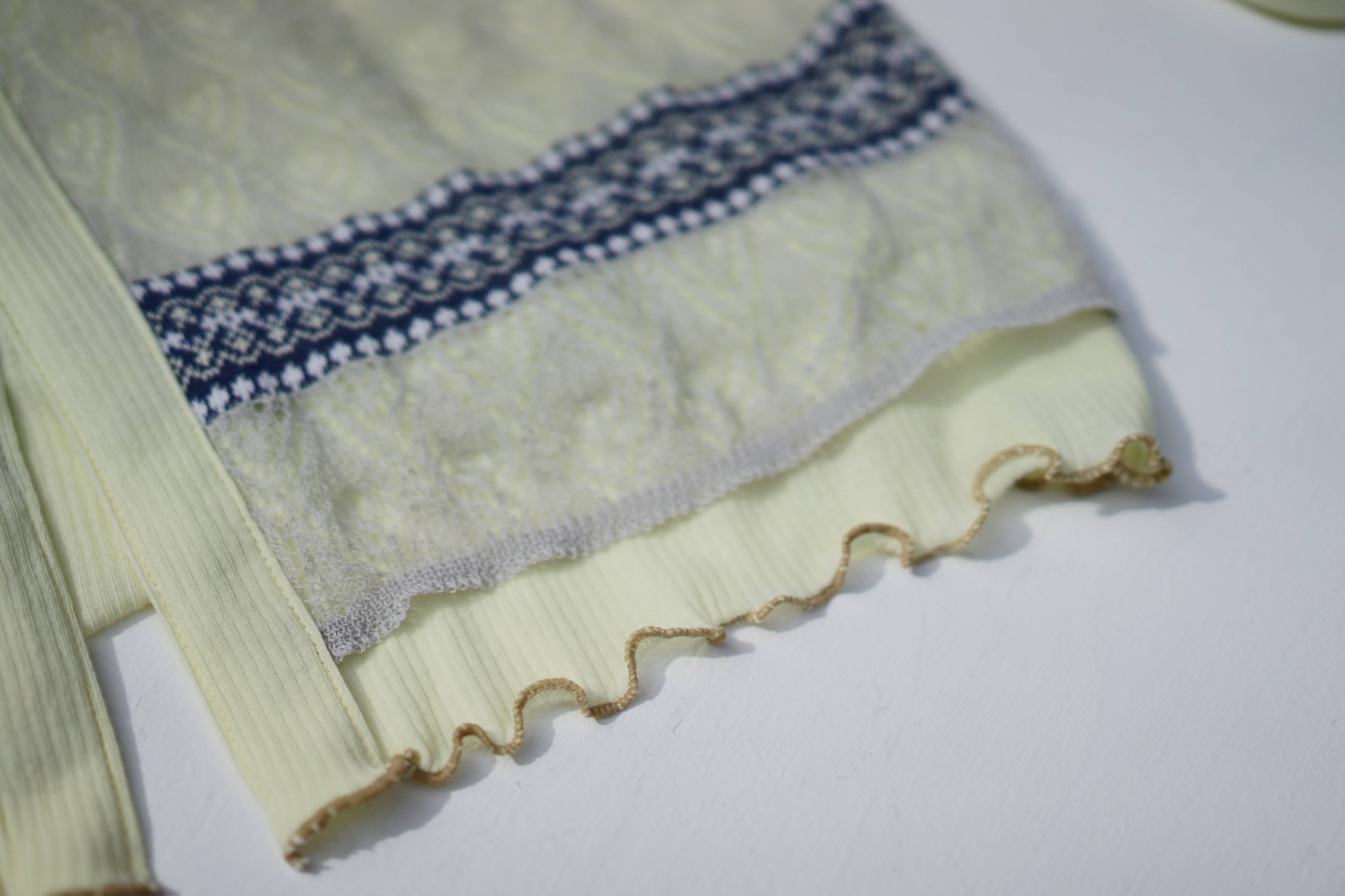 ベースのリブ素材が淡いイエローでとても可愛らしく、それに対し、レースは少し落ち着きのある淡いグレーとなる。
