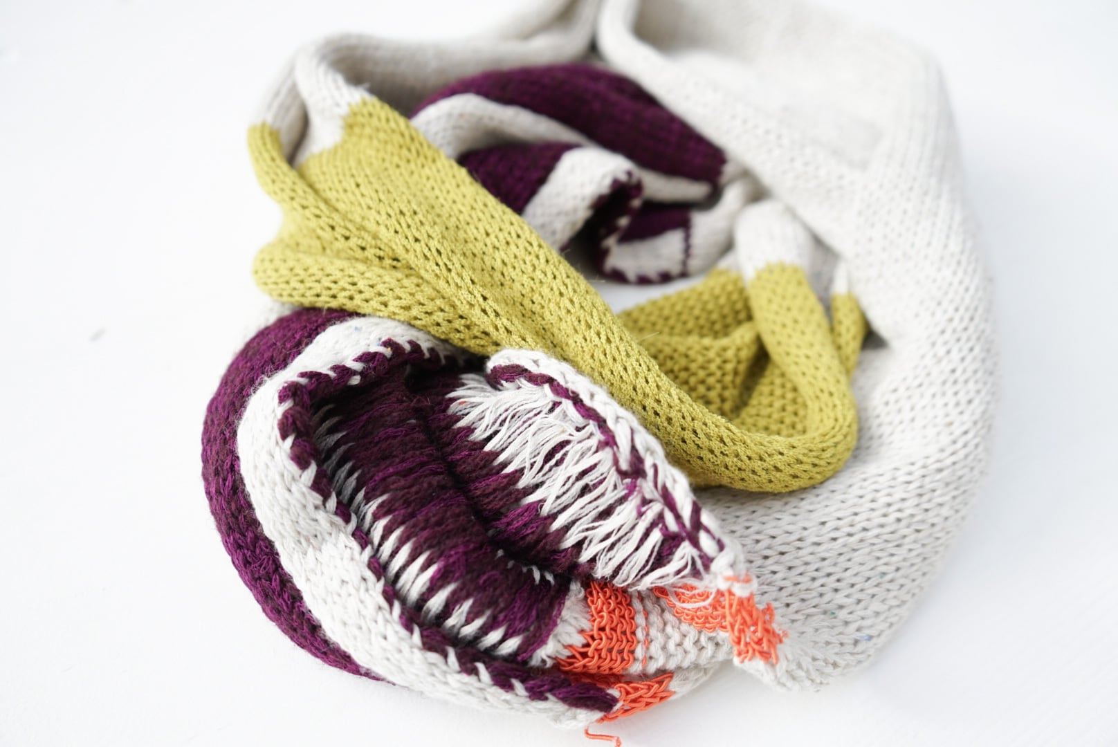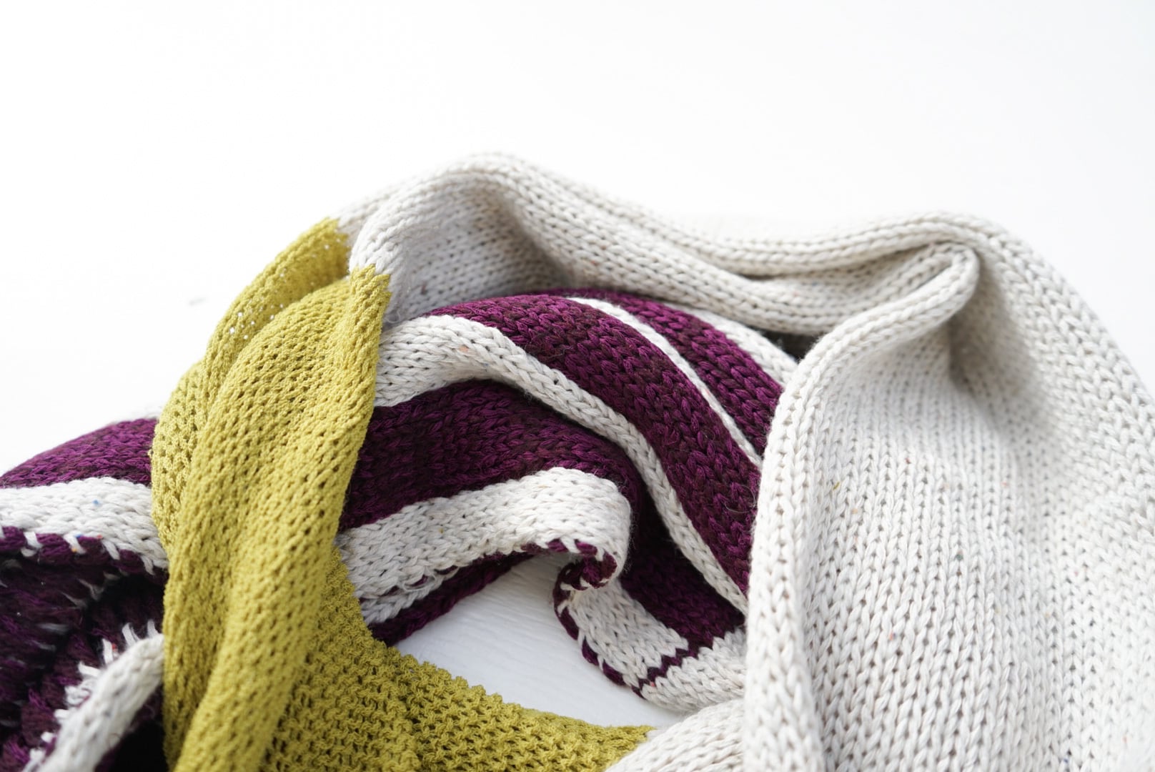 "proef"の"One Scarf"は、そんな工場から出てしまう「残糸」を用いて、家庭用編み機を使って編まれたマフラーになる。